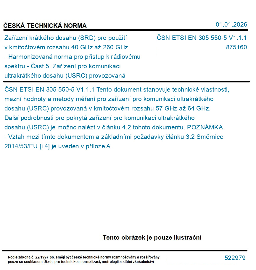 Zařízení krátkého dosahu (SRD) pro použití v kmitočtovém rozsahu 40 GHz až 260 GHz - Harmonizovaná norma pro přístup k rádiovému spektru - Část 5: Zařízení pro komunikaci ultrakrátkého dosahu (USRC) provozovaná v kmitočtovém rozsahu 57 GHz až 64 GHz