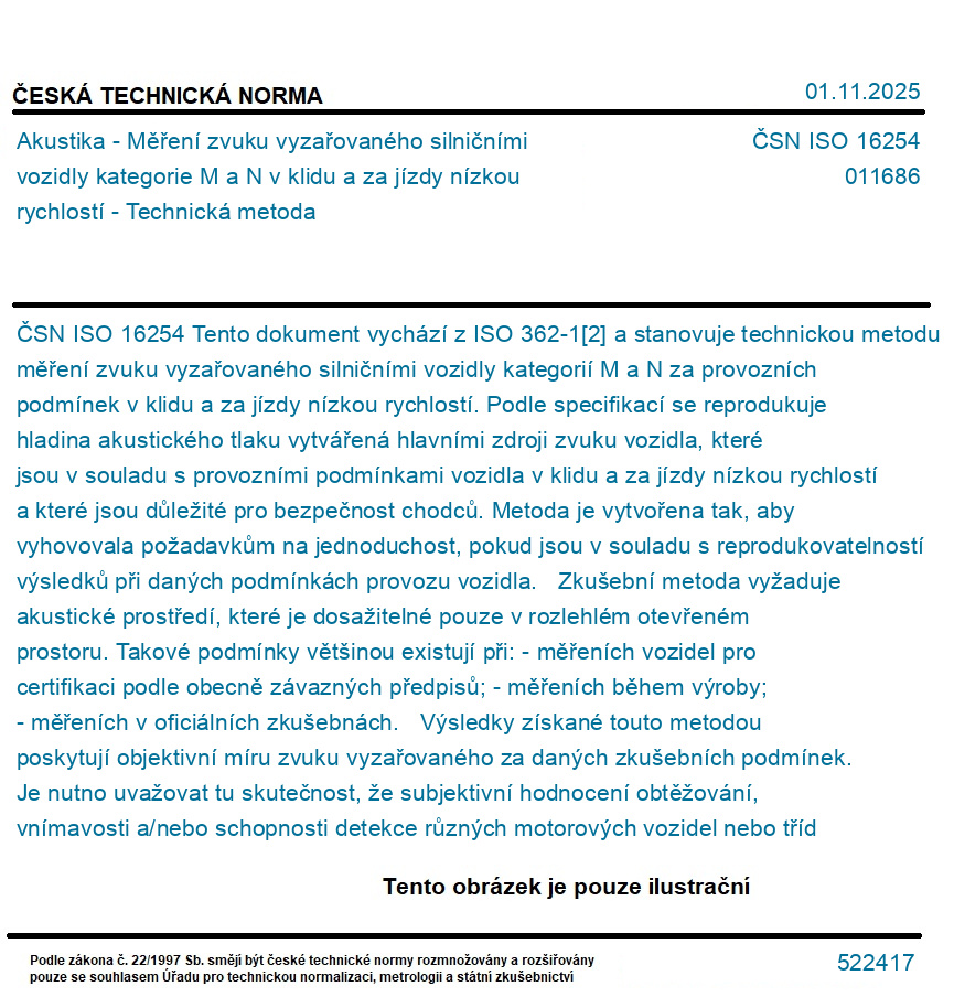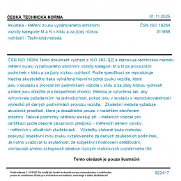 Tento dokument vychází z ISO 362-1[2] a stanovuje technickou metodu měření zvuku vyzařovaného silničními vozidly kategorií M a N za provozních podmínek v klidu a za jízdy nízkou rychlostí. Podle specifikací se reprodukuje hladina akustického tlaku vytvářená hlavními zdroji zvuku vozidla, které jsou v souladu s provozními podmínkami vozidla v klidu a za jízdy nízkou rychlostí a které jsou důležité pro bezpečnost chodců. Metoda je vytvořena tak, aby vyhovovala požadavkům na jednoduchost, pokud jsou v souladu s reprodukovatelností výsledků při daných podmínkách provozu vozidla. Zkušební metoda vyžaduje akustické prostředí, které je dosažitelné pouze v rozlehlém otevřeném prostoru. Takové podmínky většinou existují při: - měřeních vozidel pro certifikaci podle obecně závazných předpisů; - měřeních během výroby; - měřeních v oficiálních zkušebnách. Výsledky získané touto metodou poskytují objektivní míru zvuku vyzařovaného za daných zkušebních podmínek. Je nutno uvažovat tu skutečnost, že subjektivní hodnocení obtěžování, vnímavosti a/nebo schopnosti detekce různých motorových vozidel nebo tříd motorových vozidel v důsledku jejich emise zvuku se jednoduše nevztahují k indikacím zvukoměrného systému. Jelikož obtěžování, vnímavost a/nebo schopnosti detekce jsou velmi úzce spojeny s osobním vnímáním jednotlivce, fyziologickým stavem člověka, kulturou a podmínkami životního prostředí, existují velké rozdíly, a proto tyto termíny nejsou užitečné jako parametry pro popis konkrétního stavu vozidla. Namátkové kontroly náhodně vybraných vozidel zřídka probíhají v ideálním akustickém prostředí. Pokud jsou měření prováděna na vozovce v akustickém prostředí, které nesplňuje požadavky stanovené tímto dokumentem, mohly by se získané výsledky značně odchylovat od výsledků dosažených za stanovených podmínek. Kromě toho tento dokument uvádí technickou metodu měření pro stanovení účinnosti systémů generujících vnější zvuk, a to za účelem zprostředkování akustické informace chodcům o provozním stavu vozidla. Tyto informace se uvádějí jako objektivní kritéria, která se v případě systému generujícího vnější zvuk týkají hladiny akustického tlaku a frekvenčního obsahu a jejich změn jako funkce rychlosti vozidla. Tento dokument doplňuje metriku psychoakustické tonality, vztahující se k lidskému vnímání tonální hlasitosti. Psychoakustickou tonalitu je možné použít k odhadu slyšitelných frekvenčních posuvů zvuků tím, že se identifikuje nejvíce slyšitelná složka v každém slyšitelném frekvenčním pásmu (kritické pásmo), jakož se i určuje, jestli takto identifikované pásmo (pásma) vyhovuje kritériím slyšitelnosti. Příloha A a příloha C obsahuje základní informace, považované za důležité při přípravě tohoto dokumentu.