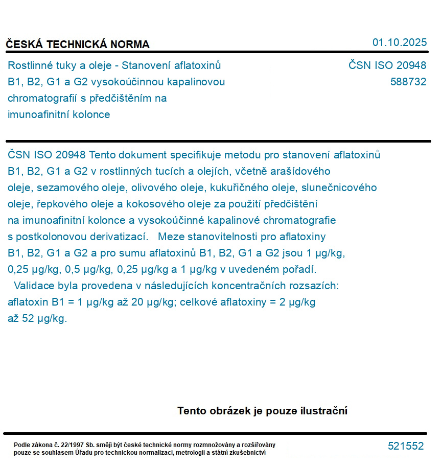 Rostlinné tuky a oleje - Stanovení aflatoxinů B1, B2, G1 a G2 vysokoúčinnou kapalinovou chromatografií s předčištěním na imunoafinitní kolonce
