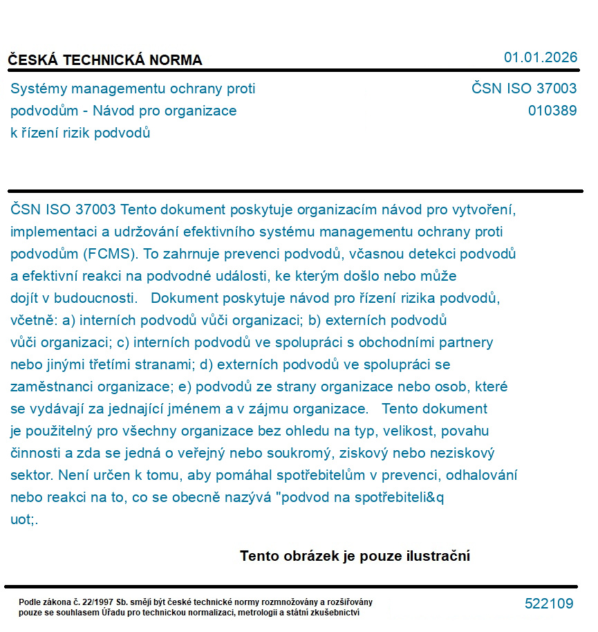 Tento dokument poskytuje organizacím návod pro vytvoření, implementaci a udržování efektivního systému managementu ochrany proti podvodům (FCMS). To zahrnuje prevenci podvodů, včasnou detekci podvodů a efektivní reakci na podvodné události, ke kterým došlo nebo může dojít v budoucnosti. Dokument poskytuje návod pro řízení rizika podvodů, včetně: a) interních podvodů vůči organizaci; b) externích podvodů vůči organizaci; c) interních podvodů ve spolupráci s obchodními partnery nebo jinými třetími stranami; d) externích podvodů ve spolupráci se zaměstnanci organizace; e) podvodů ze strany organizace nebo osob, které se vydávají za jednající jménem a v zájmu organizace. Tento dokument je použitelný pro všechny organizace bez ohledu na typ, velikost, povahu činnosti a zda se jedná o veřejný nebo soukromý, ziskový nebo neziskový sektor. Není určen k tomu, aby pomáhal spotřebitelům v prevenci, odhalování nebo reakci na to, co se obecně nazývá "podvod na spotřebiteli".
