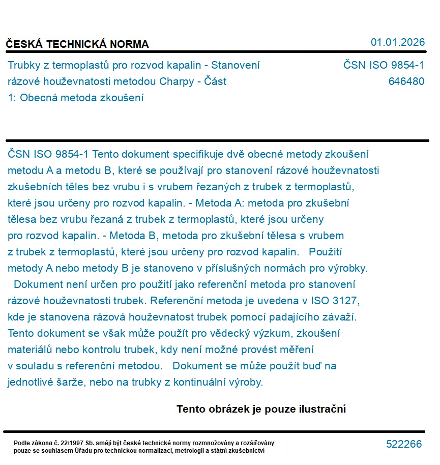 Tento dokument specifikuje dvě obecné metody zkoušení metodu A a metodu B, které se používají pro stanovení rázové houževnatosti zkušebních těles bez vrubu i s vrubem řezaných z trubek z termoplastů, které jsou určeny pro rozvod kapalin. - Metoda A: metoda pro zkušební tělesa bez vrubu řezaná z trubek z termoplastů, které jsou určeny pro rozvod kapalin. - Metoda B, metoda pro zkušební tělesa s vrubem z trubek z termoplastů, které jsou určeny pro rozvod kapalin. Použití metody A nebo metody B je stanoveno v příslušných normách pro výrobky. Dokument není určen pro použití jako referenční metoda pro stanovení rázové houževnatosti trubek. Referenční metoda je uvedena v ISO 3127, kde je stanovena rázová houževnatost trubek pomocí padajícího závaží. Tento dokument se však může použít pro vědecký výzkum, zkoušení materiálů nebo kontrolu trubek, kdy není možné provést měření v souladu s referenční metodou. Dokument se může použít buď na jednotlivé šarže, nebo na trubky z kontinuální výroby.