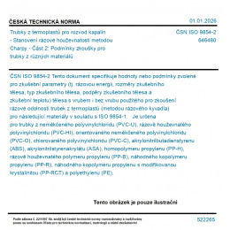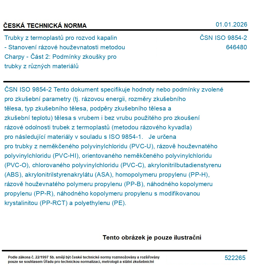 Tento dokument specifikuje hodnoty nebo podmínky zvolené pro zkušební parametry (tj. rázovou energii, rozměry zkušebního tělesa, typ zkušebního tělesa, podpěry zkušebního tělesa a zkušební teplotu) tělesa s vrubem i bez vrubu použitého pro zkoušení rázové odolnosti trubek z termoplastů (metodou rázového kyvadla) pro následující materiály v souladu s ISO 9854-1. Je určena pro trubky z neměkčeného polyvinylchloridu (PVC-U), rázově houževnatého polyvinylchloridu (PVC-HI), orientovaného neměkčeného polyvinylchloridu (PVC-O), chlorovaného polyvinylchloridu (PVC-C), akrylonitrilbutadienstyrenu (ABS), akrylonitrilstyrenakrylátu (ASA), homopolymeru propylenu (PP-H), rázově houževnatého polymeru propylenu (PP-B), náhodného kopolymeru propylenu (PP-R), náhodného kopolymeru propylenu s modifikovanou krystalinitou (PP-RCT) a polyethylenu (PE).