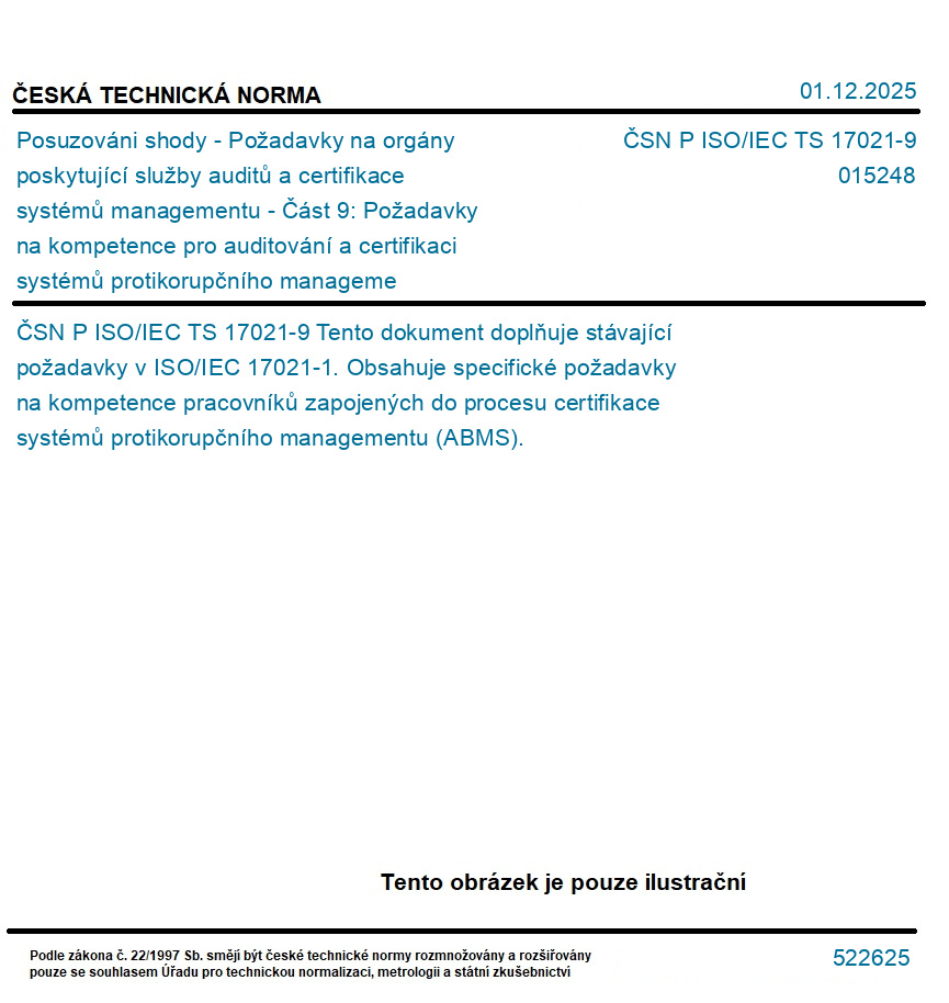 Posuzováni shody - Požadavky na orgány poskytující služby auditů a certifikace systémů managementu - Část 9: Požadavky na kompetence pro auditování a certifikaci systémů protikorupčního managementu