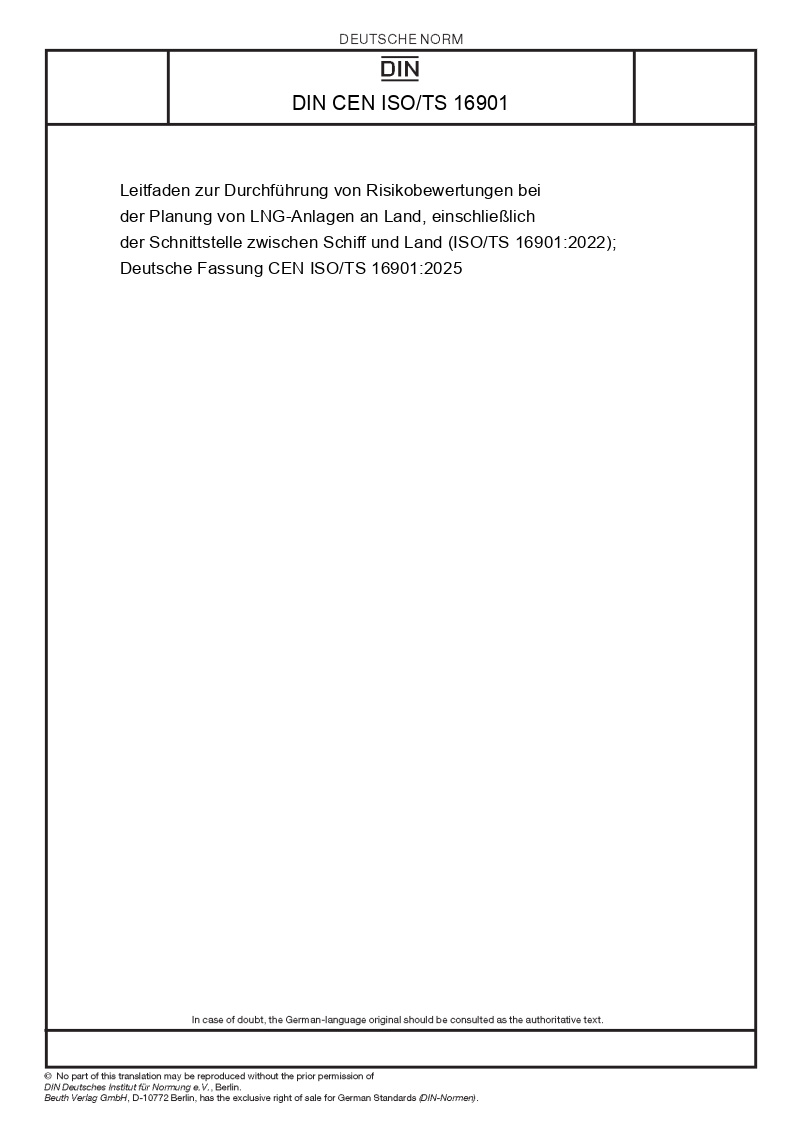Leitfaden zur Durchführung von Risikobewertungen bei der Planung von LNG-Anlagen an Land, einschließlich der Schnittstelle zwischen Schiff und Land (ISO/TS 16901:2022); Deutsche Fassung CEN ISO/TS 16901:2025