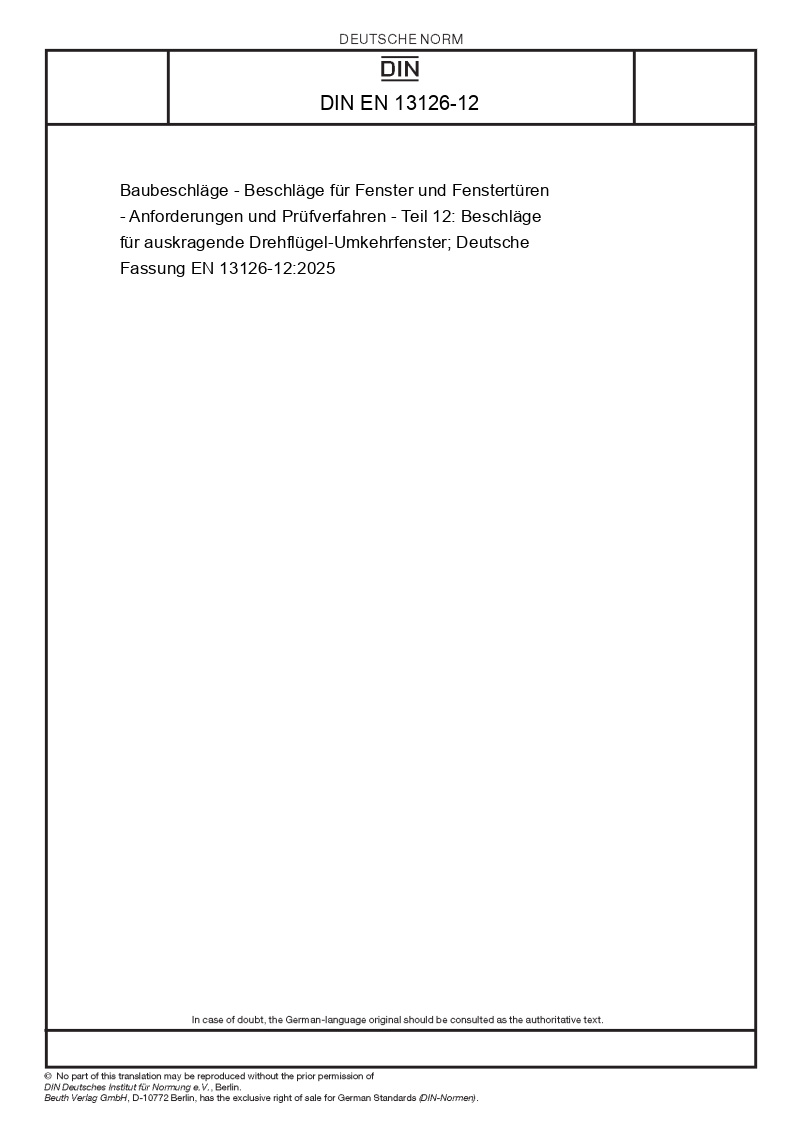 | Název produktu: | Baubeschläge - Beschläge für Fenster und Fenstertüren - Anforderungen und Prüfverfahren - Teil 12: Beschläge für auskragende Drehflügel-Umkehrfenster; Deutsche Fassung EN 13126-12:2025 |