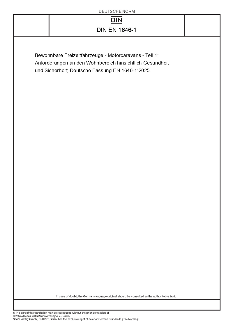 | Název produktu: | Bewohnbare Freizeitfahrzeuge - Motorcaravans - Teil 1: Anforderungen an den Wohnbereich hinsichtlich Gesundheit und Sicherheit; Deutsche Fassung EN 1646-1:2025 |