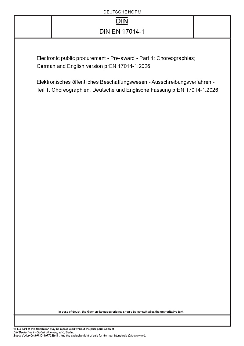 | Název produktu: | Electronic public procurement - Pre-award - Part 1: Choreographies; German and English version prEN 17014-1:2026 |