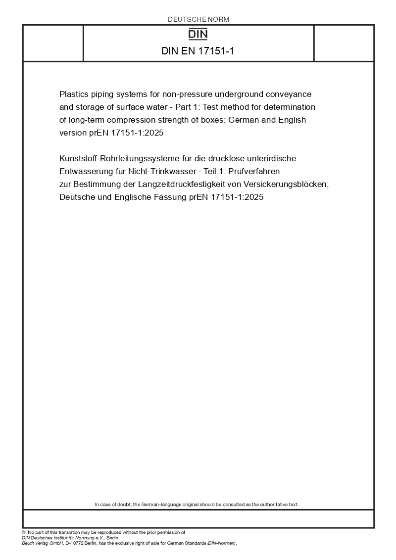 Kunststoff-Rohrleitungssysteme für die drucklose unterirdische Entwässerung für Nicht-Trinkwasser - Teil 1: Prüfverfahren zur Bestimmung der Langzeitdruckfestigkeit von Versickerungsblöcken; Deutsche und Englische Fassung prEN 17151-1:2025