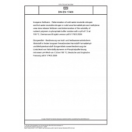 Düngemittel - Bestimmung von kalt- und heißwasserunlöslichem Stickstoff in festen langsam freisetzenden Harnstoff-Formaldehyd- und Methylenharnstoff-Düngemitteln sowie Bestimmung der Löslichkeit von Nährstoffpolymeren in Phosphatpufferlösung mit einem pH-Wert von 7,5 bei 100 °C; Deutsche und Englische Fassung prEN 17403:2026