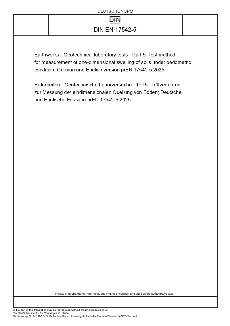 Earthworks - Geotechnical laboratory tests - Part 5: Test method for measurement of one-dimensional swelling of soils under oedometric condition; German and English version prEN 17542-5:2025