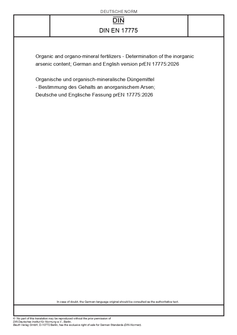| Název produktu: | Organic and organo-mineral fertilizers - Determination of the inorganic arsenic content; German and English version prEN 17775:2026 |