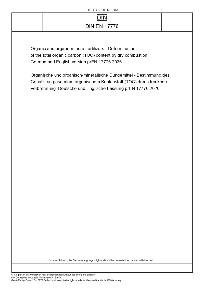 | Název produktu: | Organic and organo-mineral fertilizers - Determination of the total organic carbon (TOC) content by dry combustion; German and English version prEN 17776:2026 |
