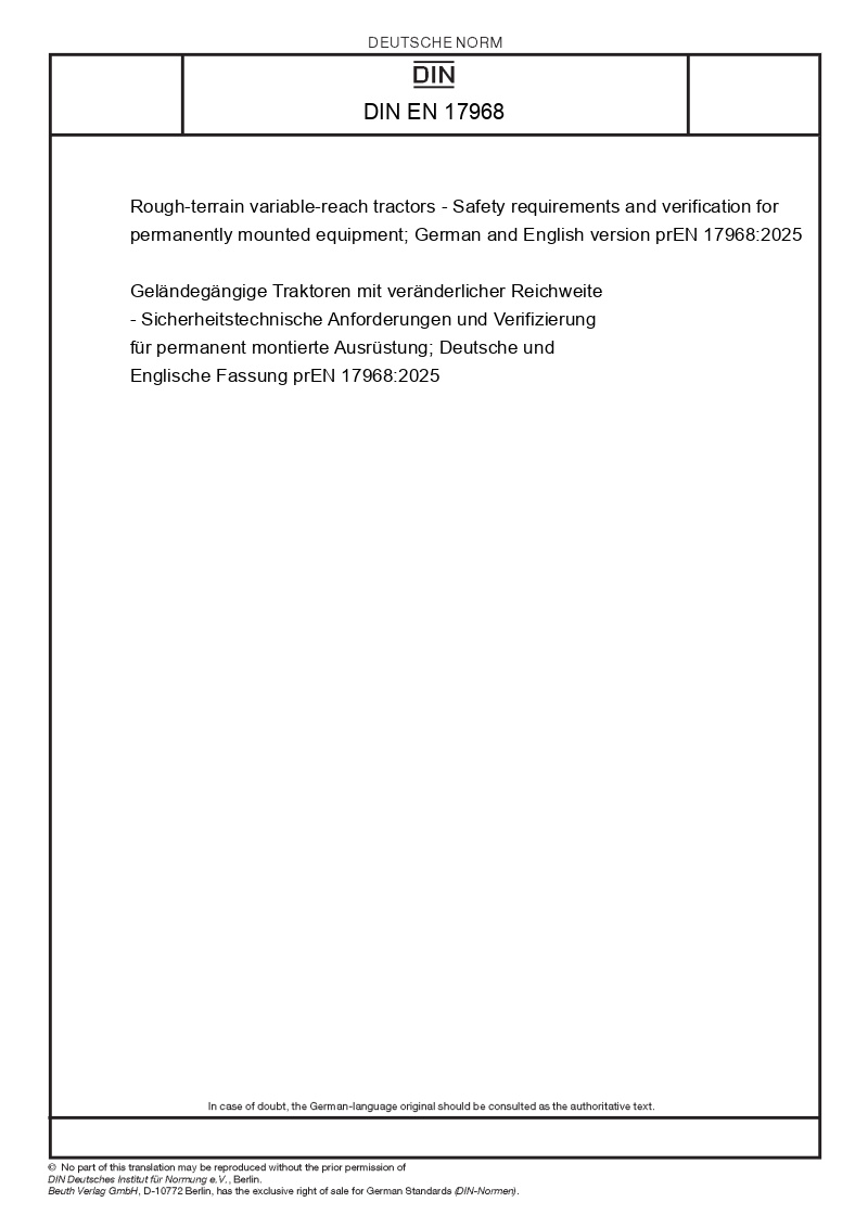 Rough-terrain variable-reach tractors - Safety requirements and verification for permanently mounted equipment; German and English version prEN 17968:2025