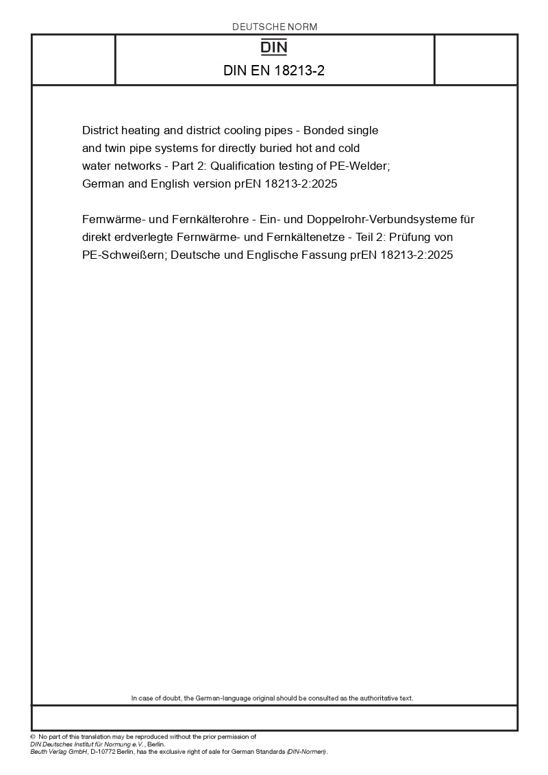 District heating and district cooling pipes - Bonded single and twin pipe systems for directly buried hot and cold water networks - Part 2: Qualification testing of PE-Welder; German and English version prEN 18213-2:2025