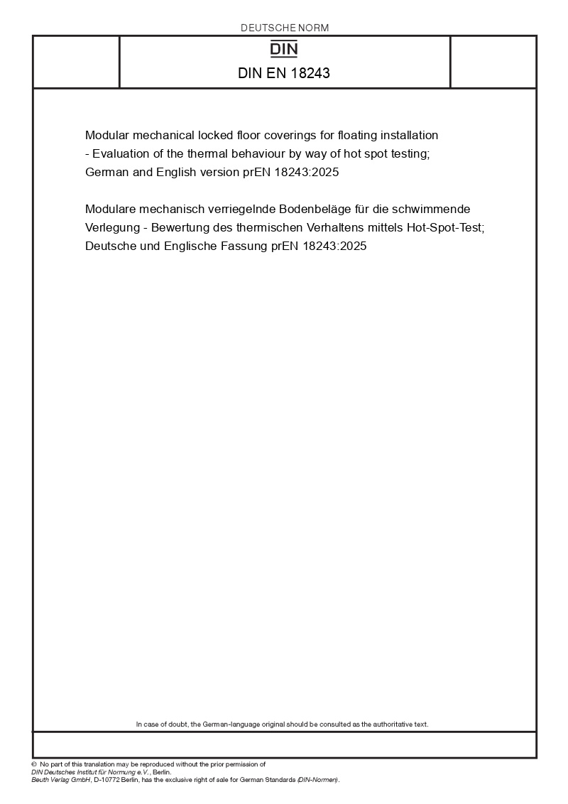 | Název produktu: | Modular mechanical locked floor coverings for floating installation - Evaluation of the thermal behaviour by way of hot spot testing; German and English version prEN 18243:2025 |