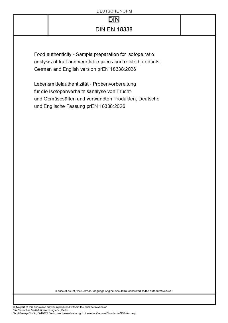 Lebensmittelauthentizität - Probenvorbereitung für die Isotopenverhältnisanalyse von Frucht- und Gemüsesäften und verwandten Produkten; Deutsche und Englische Fassung prEN 18338:2026