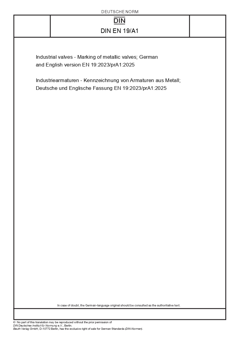 | Název produktu: | Industrial valves - Marking of metallic valves; German and English version EN 19:2023/prA1:2025 |