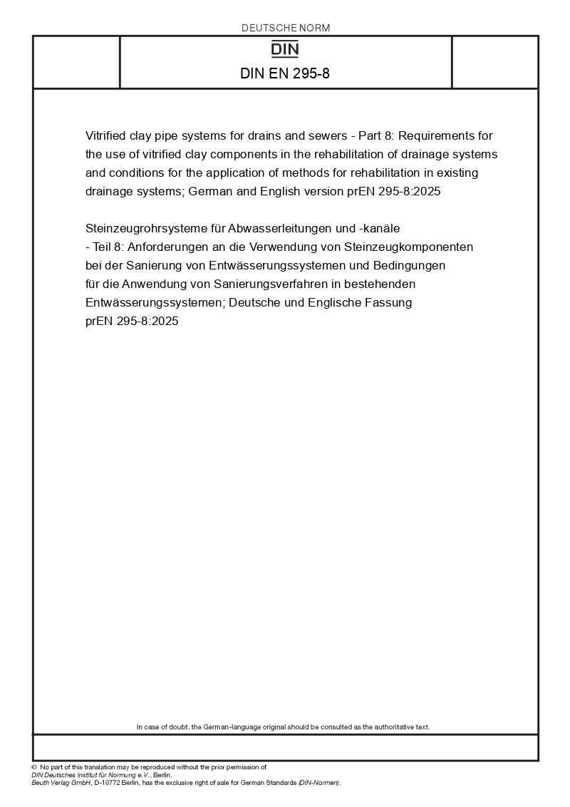 Steinzeugrohrsysteme für Abwasserleitungen und -kanäle - Teil 8: Anforderungen an die Verwendung von Steinzeugkomponenten bei der Sanierung von Entwässerungssystemen und Bedingungen für die Anwendung von Sanierungsverfahren in bestehenden Entwässerungssystemen; Deutsche und Englische Fassung prEN 295-8:2025