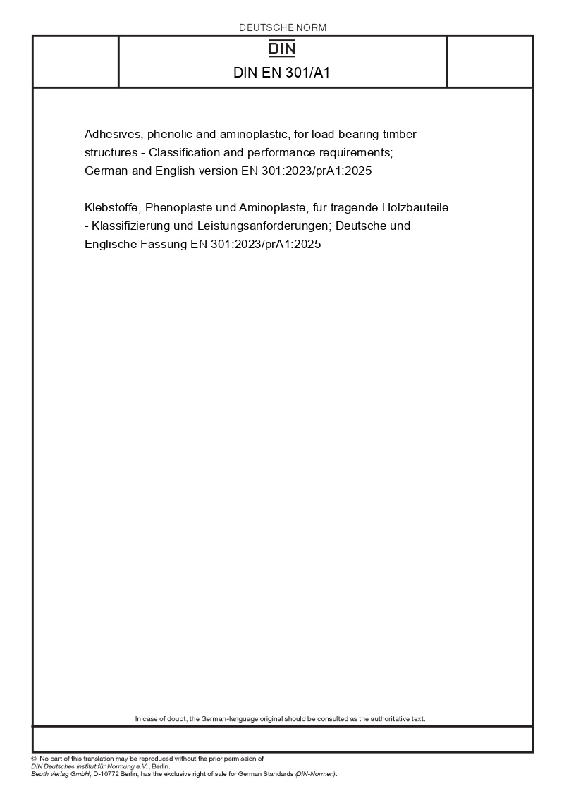 Adhesives, phenolic and aminoplastic, for load-bearing timber structures - Classification and performance requirements; German and English version EN 301:2023/prA1:2025