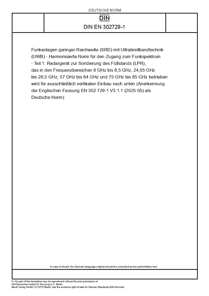Funkanlagen geringer Reichweite (SRD) mit Ultrabreitbandtechnik (UWB) - Harmonisierte Norm für den Zugang zum Funkspektrum - Teil 1: Radargerät zur Sondierung des Füllstands (LPR), das in den Frequenzbereichen 6 GHz bis 8,5 GHz, 24,05 GHz bis 26,5 GHz, 57 GHz bis 64 GHz und 75 GHz bis 85 GHz betrieben wird für ausschließlich vertikalen Einbau nach unten (Anerkennung der Englischen Fassung EN 302 729-1 V3.1.1 (2025-05) als Deutsche Norm)