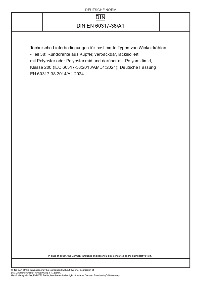 Technische Lieferbedingungen für bestimmte Typen von Wickeldrähten - Teil 38: Runddrähte aus Kupfer, verbackbar, lackisoliert mit Polyester oder Polyesterimid und darüber mit Polyamidimid, Klasse 200 (IEC 60317-38:2013/AMD1:2024); Deutsche Fassung EN 60317-38:2014/A1:2024