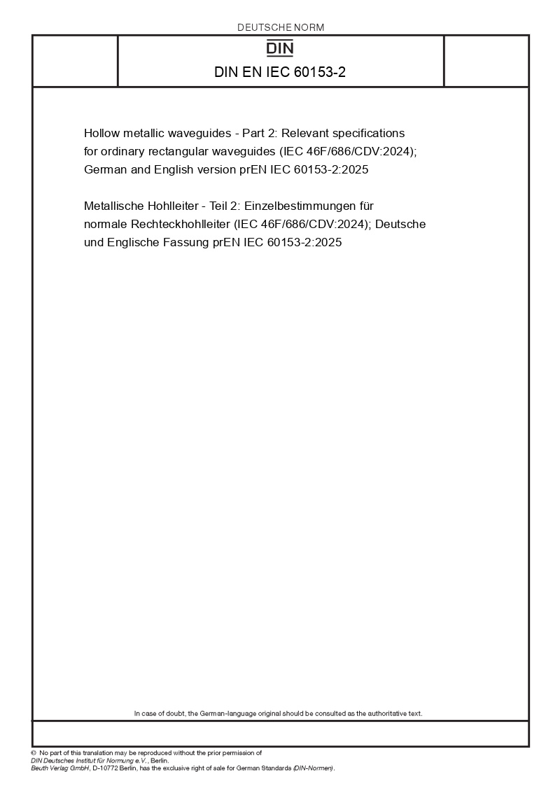 Hollow metallic waveguides - Part 2: Relevant specifications for ordinary rectangular waveguides (IEC 46F/686/CDV:2024); German and English version prEN IEC 60153-2:2025