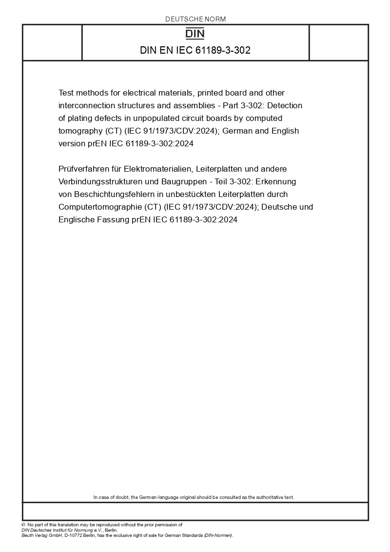 Test methods for electrical materials, printed board and other interconnection structures and assemblies - Part 3-302: Detection of plating defects in unpopulated circuit boards by computed tomography (CT) (IEC 91/1973/CDV:2024); German and English version prEN IEC 61189-3-302:2024