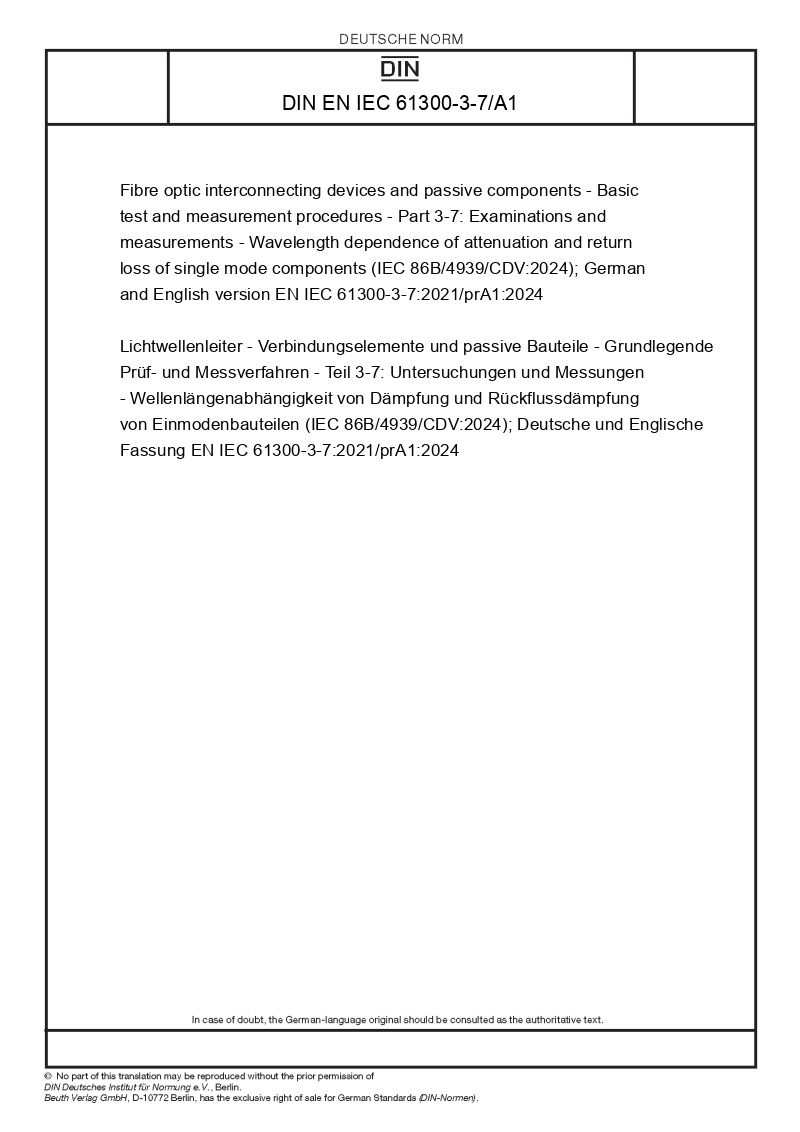 Lichtwellenleiter - Verbindungselemente und passive Bauteile - Grundlegende Prüf- und Messverfahren - Teil 3-7: Untersuchungen und Messungen - Wellenlängenabhängigkeit von Dämpfung und Rückflussdämpfung von Einmodenbauteilen (IEC 86B/4939/CDV:2024); Deutsche und Englische Fassung EN IEC 61300-3-7:2021/prA1:2024