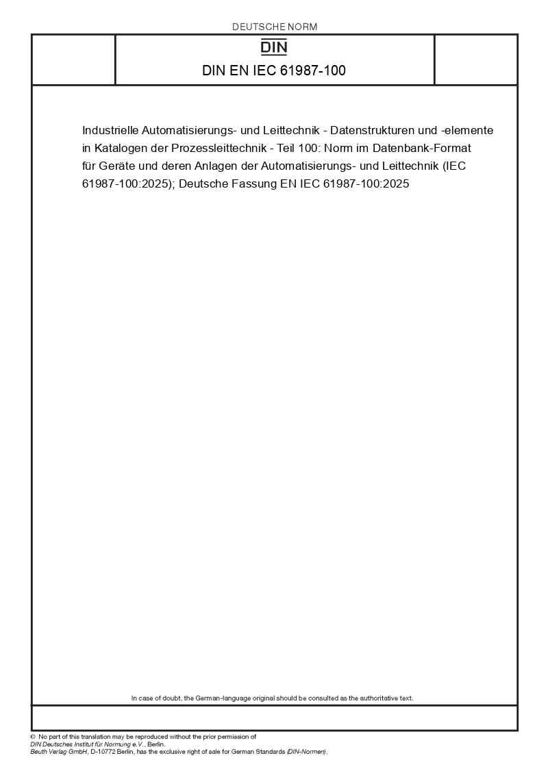 Industrielle Automatisierungs- und Leittechnik - Datenstrukturen und -elemente in Katalogen der Prozessleittechnik - Teil 100: Norm im Datenbank-Format für Geräte und deren Anlagen der Automatisierungs- und Leittechnik (IEC 61987-100:2025); Deutsche Fassung EN IEC 61987-100:2025