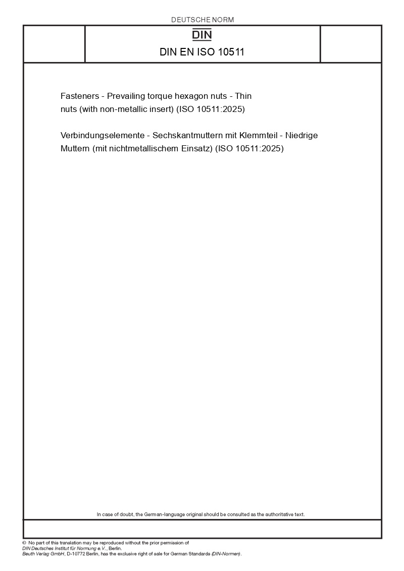 Fasteners - Prevailing torque hexagon nuts - Thin nuts (with non-metallic insert) (ISO 10511:2025)
