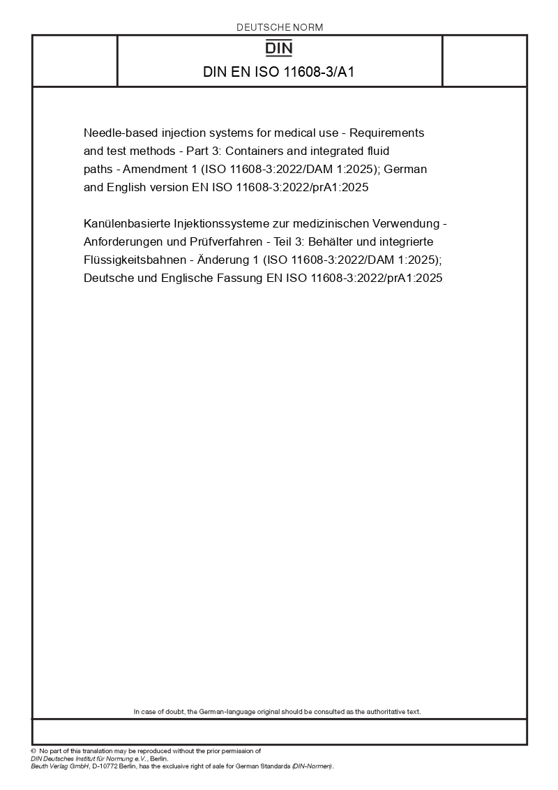 Needle-based injection systems for medical use - Requirements and test methods - Part 3: Containers and integrated fluid paths - Amendment 1 (ISO 11608-3:2022/DAM 1:2025); German and English version EN ISO 11608-3:2022/prA1:2025