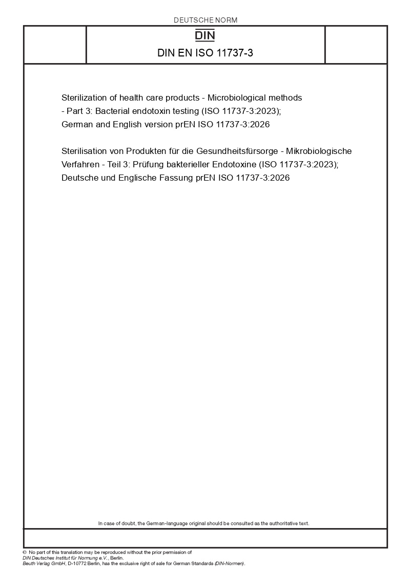 Sterilisation von Produkten für die Gesundheitsfürsorge - Mikrobiologische Verfahren - Teil 3: Prüfung bakterieller Endotoxine (ISO 11737-3:2023); Deutsche und Englische Fassung prEN ISO 11737-3:2026