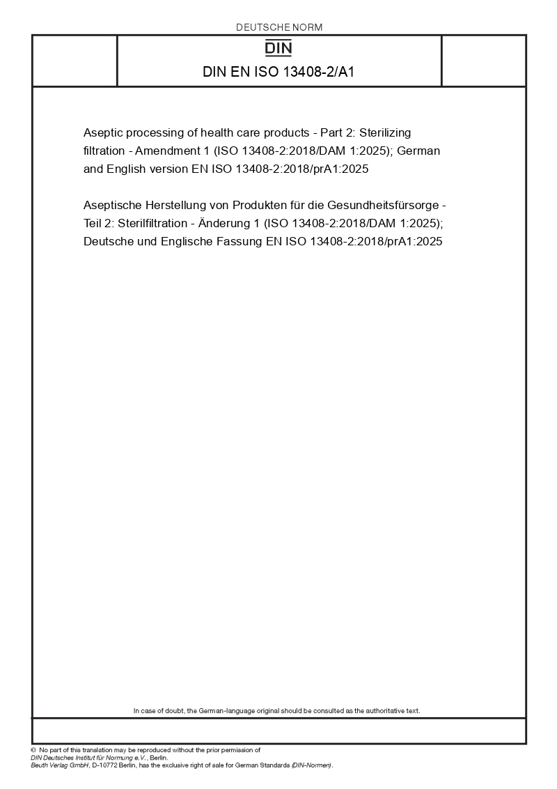 Aseptic processing of health care products - Part 2: Sterilizing filtration - Amendment 1 (ISO 13408-2:2018/DAM 1:2025); German and English version EN ISO 13408-2:2018/prA1:2025