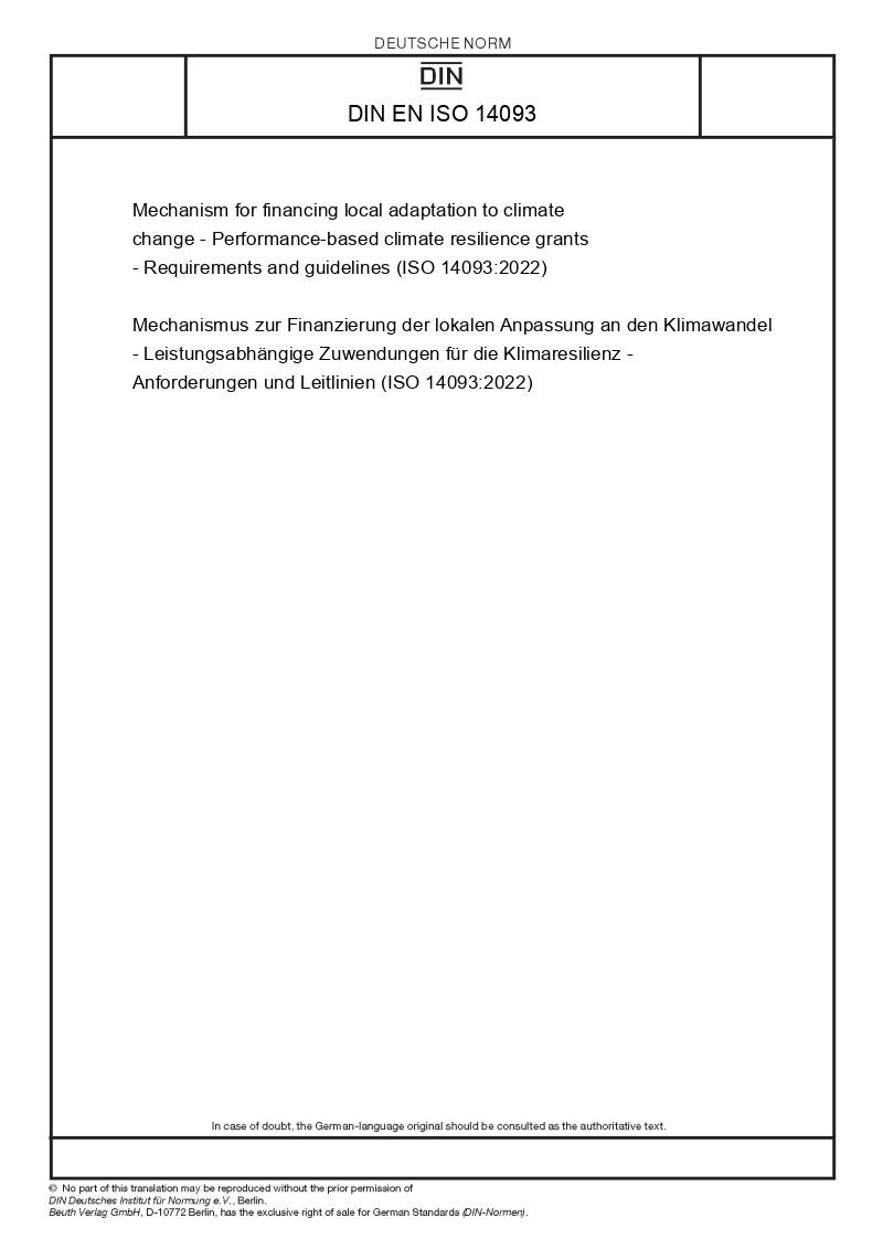 Mechanismus zur Finanzierung der lokalen Anpassung an den Klimawandel - Leistungsabhängige Zuwendungen für die Klimaresilienz - Anforderungen und Leitlinien (ISO 14093:2022)