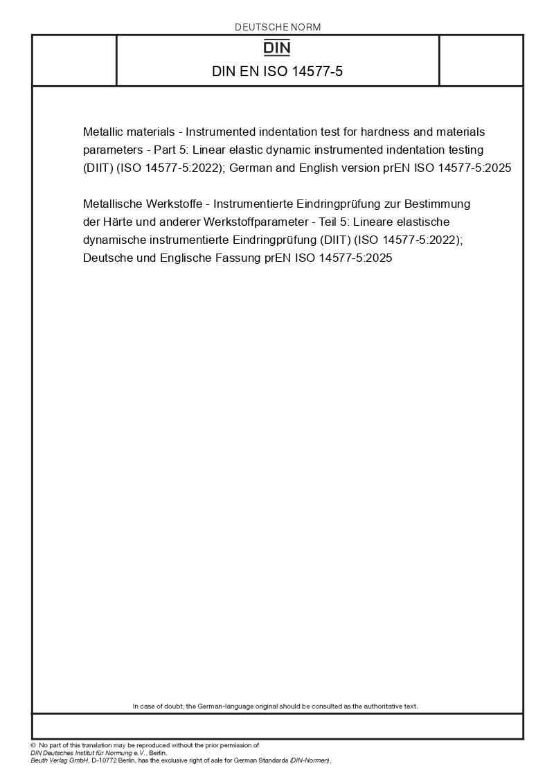 Metallic materials - Instrumented indentation test for hardness and materials parameters - Part 5: Linear elastic dynamic instrumented indentation testing (DIIT) (ISO 14577-5:2022); German and English version prEN ISO 14577-5:2025