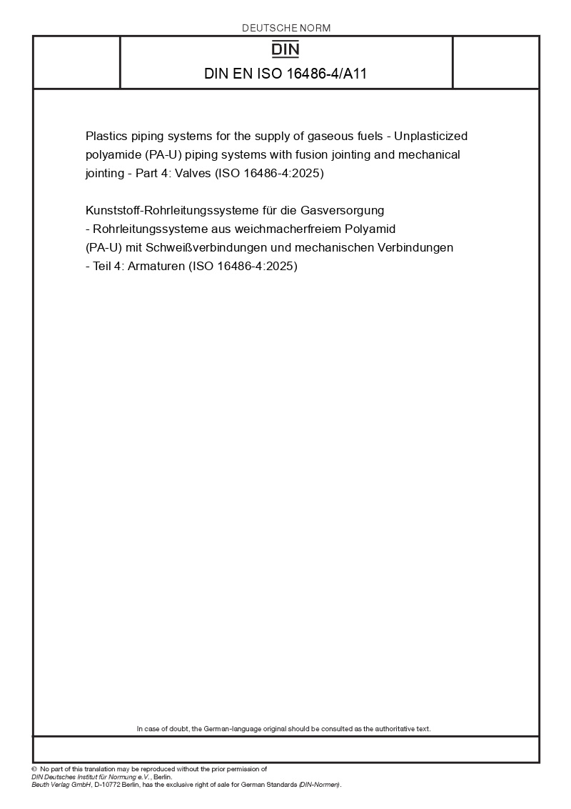 Kunststoff-Rohrleitungssysteme für die Gasversorgung - Rohrleitungssysteme aus weichmacherfreiem Polyamid (PA-U) mit Schweißverbindungen und mechanischen Verbindungen - Teil 4: Armaturen (ISO 16486-4:2025)