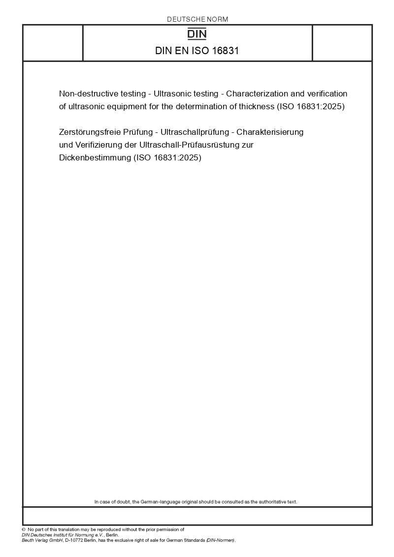 Zerstörungsfreie Prüfung - Ultraschallprüfung - Charakterisierung und Verifizierung der Ultraschall-Prüfausrüstung zur Dickenbestimmung (ISO 16831:2025)