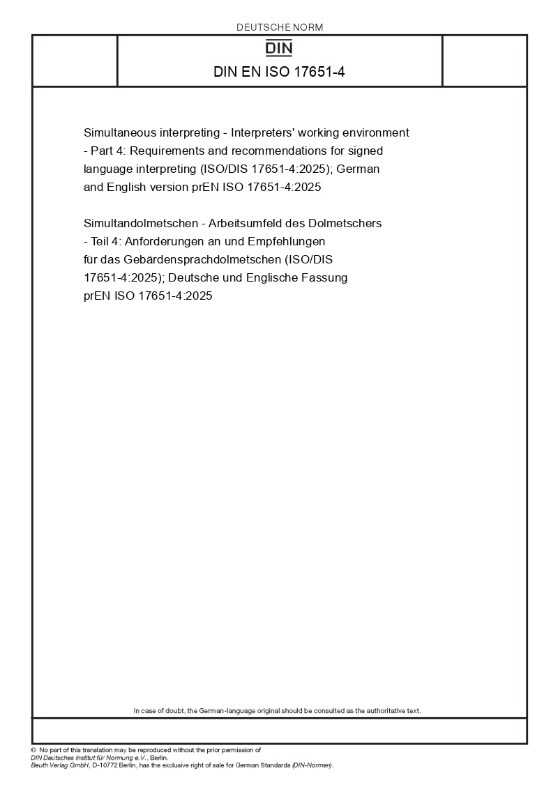 Simultaneous interpreting - Interpreters' working environment - Part 4: Requirements and recommendations for signed language interpreting (ISO/DIS 17651-4:2025); German and English version prEN ISO 17651-4:2025
