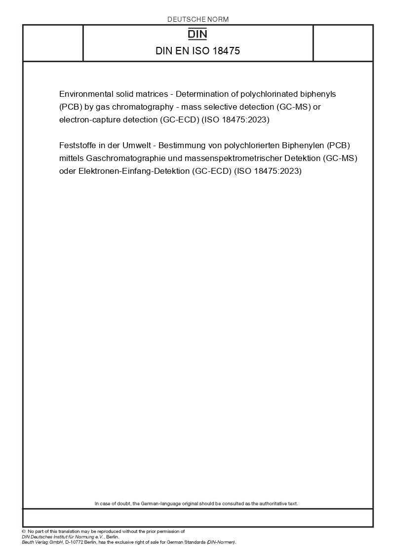 Environmental solid matrices - Determination of polychlorinated biphenyls (PCB) by gas chromatography - mass selective detection (GC-MS) or electron-capture detection (GC-ECD) (ISO 18475:2023)
