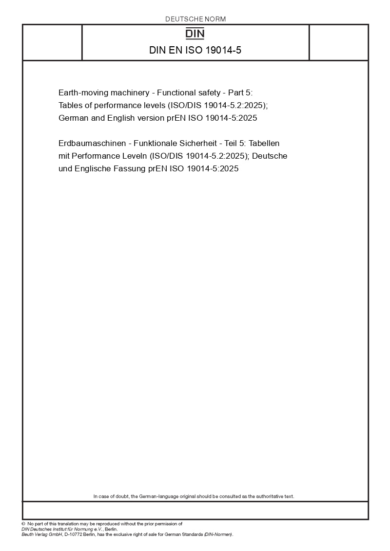 Earth-moving machinery - Functional safety - Part 5: Tables of performance levels (ISO/DIS 19014-5.2:2025); German and English version prEN ISO 19014-5:2025