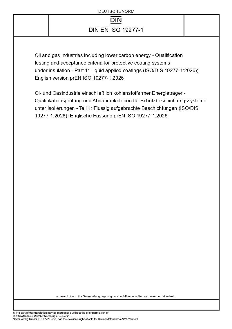 Öl- und Gasindustrie einschließlich kohlenstoffarmer Energieträger - Qualifikationsprüfung und Abnahmekriterien für Schutzbeschichtungssysteme unter Isolierungen - Teil 1: Flüssig aufgebrachte Beschichtungen (ISO/DIS 19277-1:2026); Englische Fassung prEN ISO 19277-1:2026