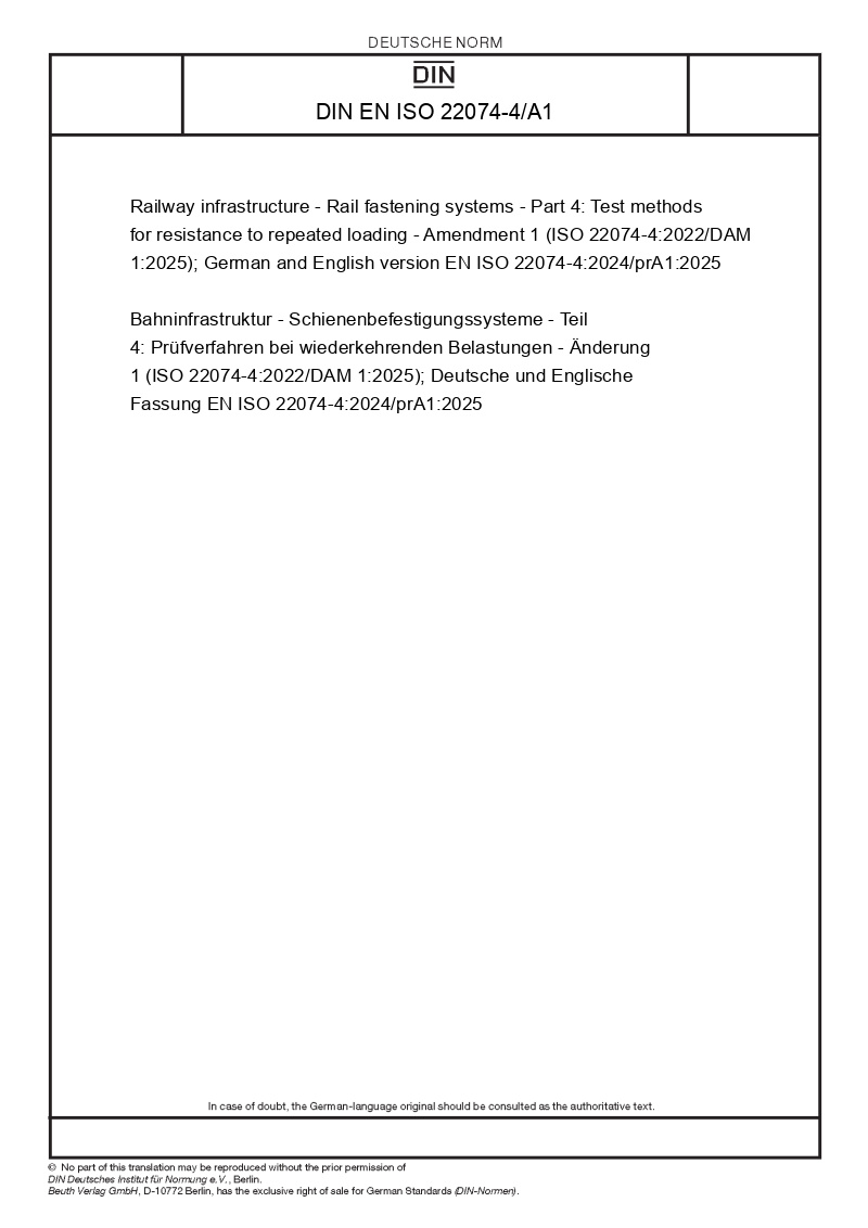 Railway infrastructure - Rail fastening systems - Part 4: Test methods for resistance to repeated loading - Amendment 1 (ISO 22074-4:2022/DAM 1:2025); German and English version EN ISO 22074-4:2024/prA1:2025