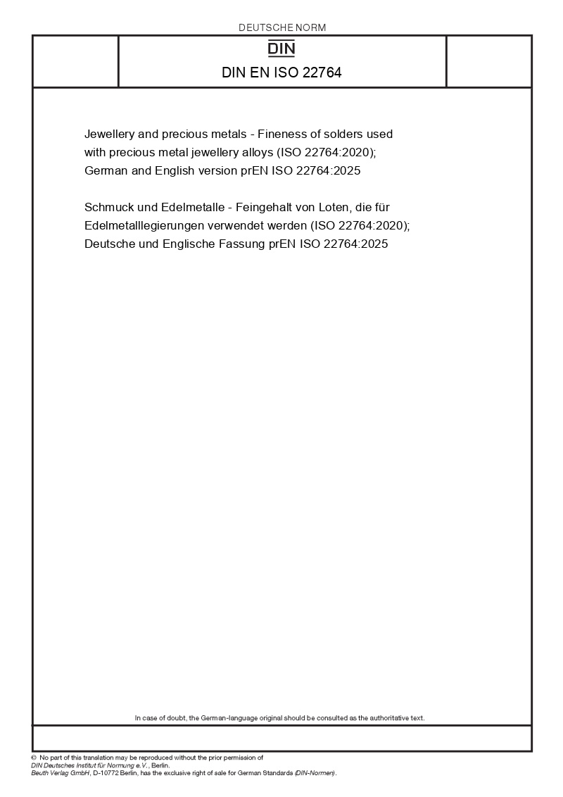 Jewellery and precious metals - Fineness of solders used with precious metal jewellery alloys (ISO 22764:2020); German and English version prEN ISO 22764:2025