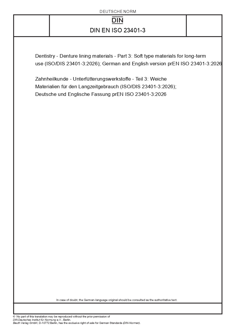Dentistry - Denture lining materials - Part 3: Soft type materials for long-term use (ISO/DIS 23401-3:2026); German and English version prEN ISO 23401-3:2026