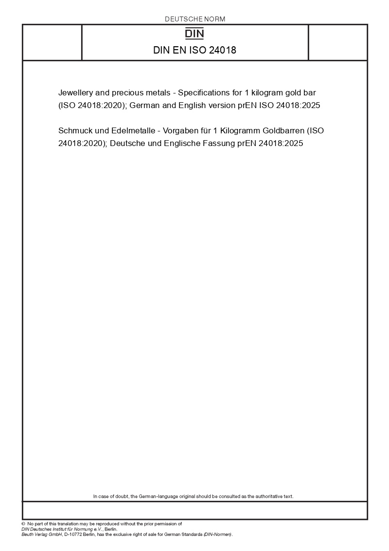 Jewellery and precious metals - Specifications for 1 kilogram gold bar (ISO 24018:2020); German and English version prEN ISO 24018:2025