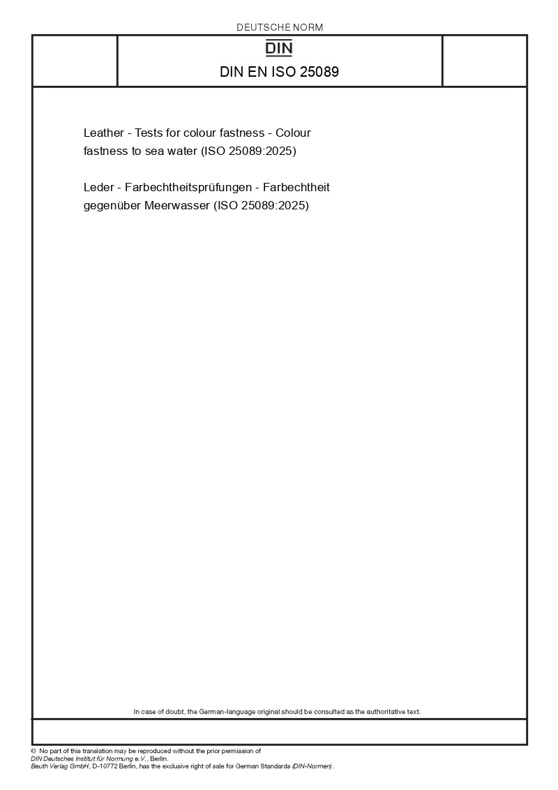 Leder - Farbechtheitsprüfungen - Farbechtheit gegenüber Meerwasser (ISO 25089:2025)