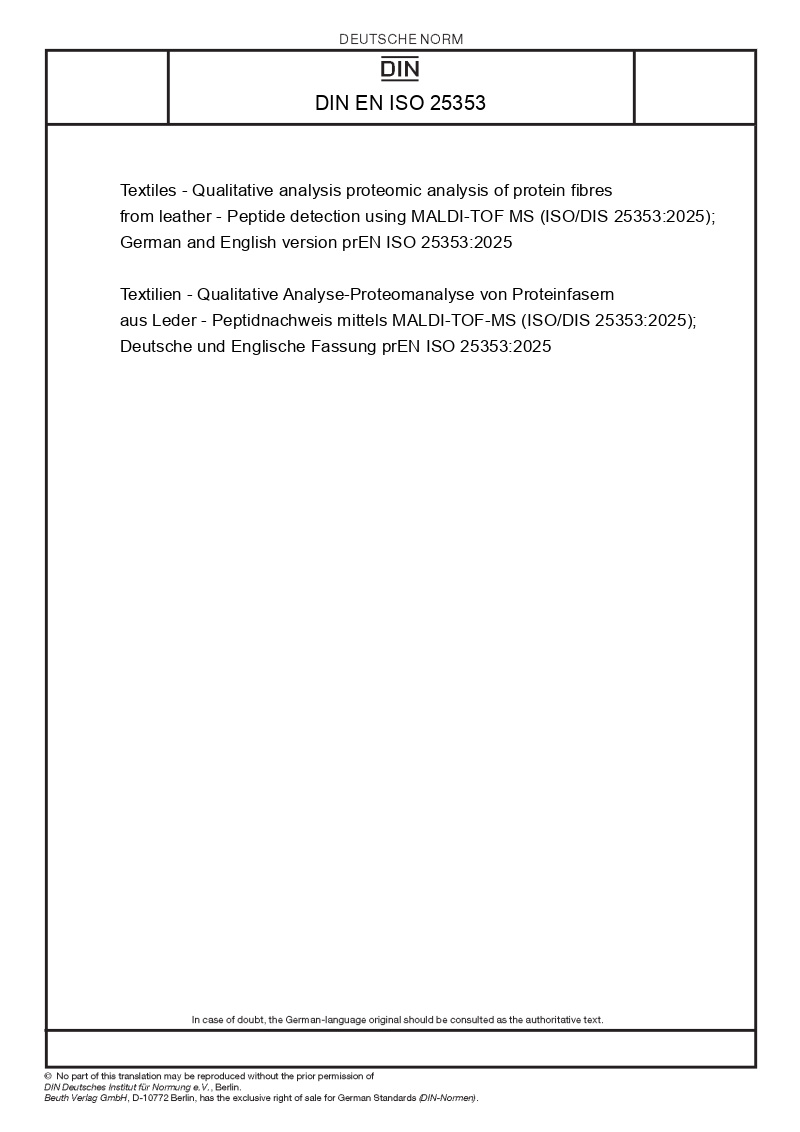 Textiles - Qualitative analysis proteomic analysis of protein fibres from leather - Peptide detection using MALDI-TOF MS (ISO/DIS 25353:2025); German and English version prEN ISO 25353:2025