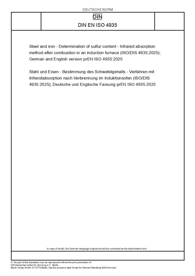 Steel and iron - Determination of sulfur content - Infrared absorption method after combustion in an induction furnace (ISO/DIS 4935:2025); German and English version prEN ISO 4935:2025