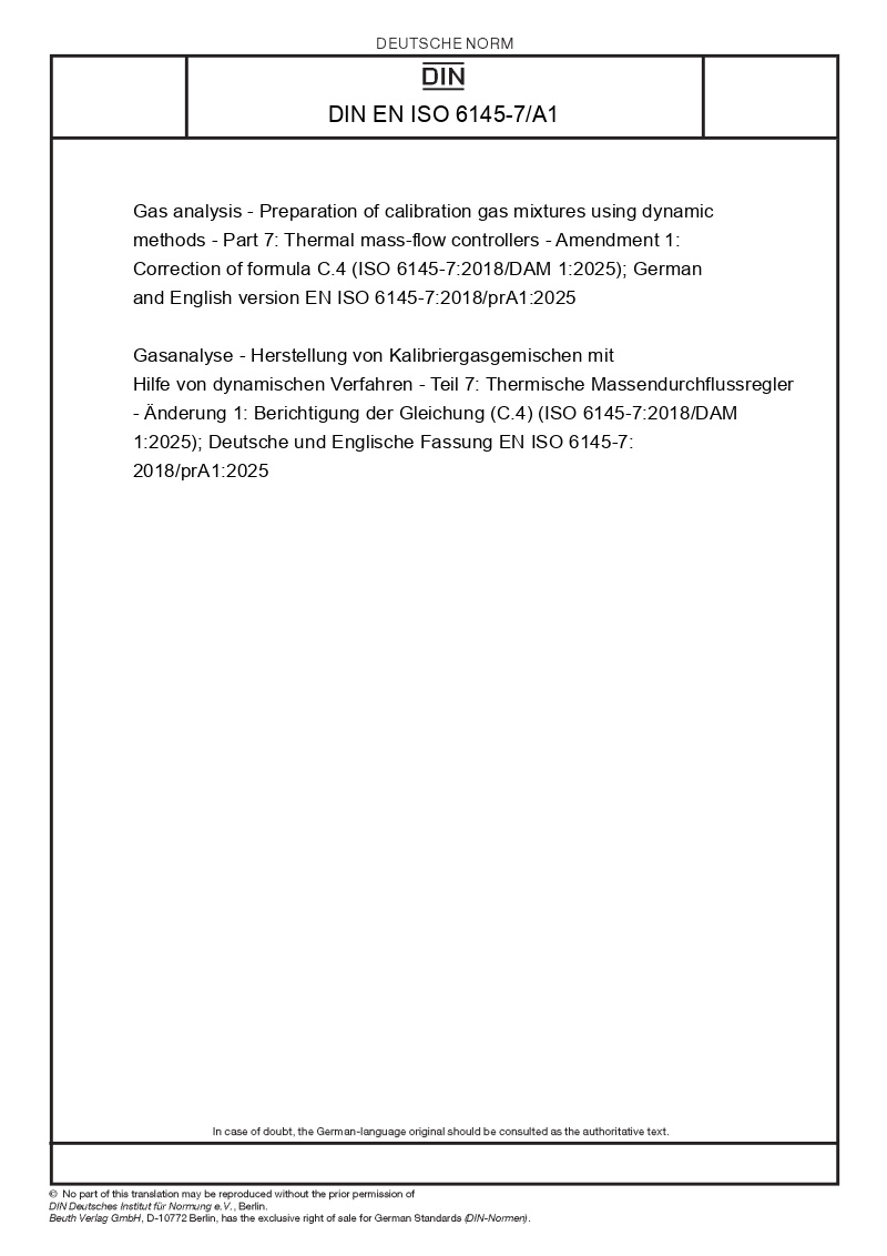 Gas analysis - Preparation of calibration gas mixtures using dynamic methods - Part 7: Thermal mass-flow controllers - Amendment 1: Correction of formula C.4 (ISO 6145-7:2018/DAM 1:2025); German and English version EN ISO 6145-7:2018/prA1:2025