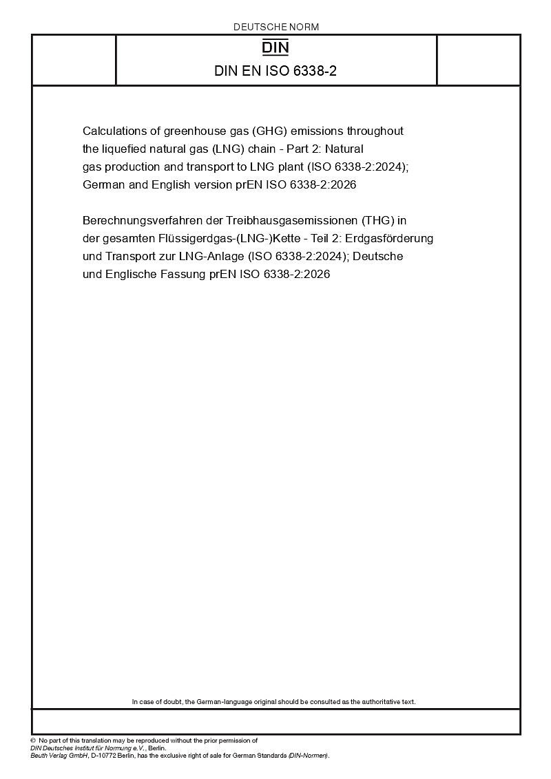 Berechnungsverfahren der Treibhausgasemissionen (THG) in der gesamten Flüssigerdgas-(LNG-)Kette - Teil 2: Erdgasförderung und Transport zur LNG-Anlage (ISO 6338-2:2024); Deutsche und Englische Fassung prEN ISO 6338-2:2026